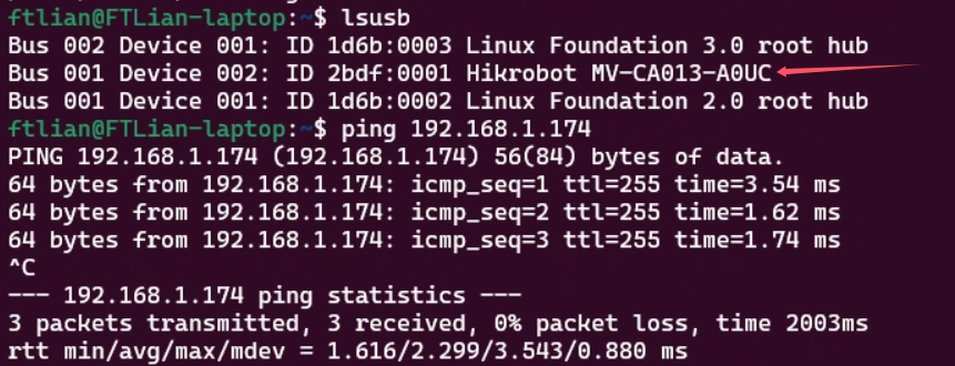 lsusb #检查usb设备挂载 ping 192.168.1.174 #检查雷达通讯