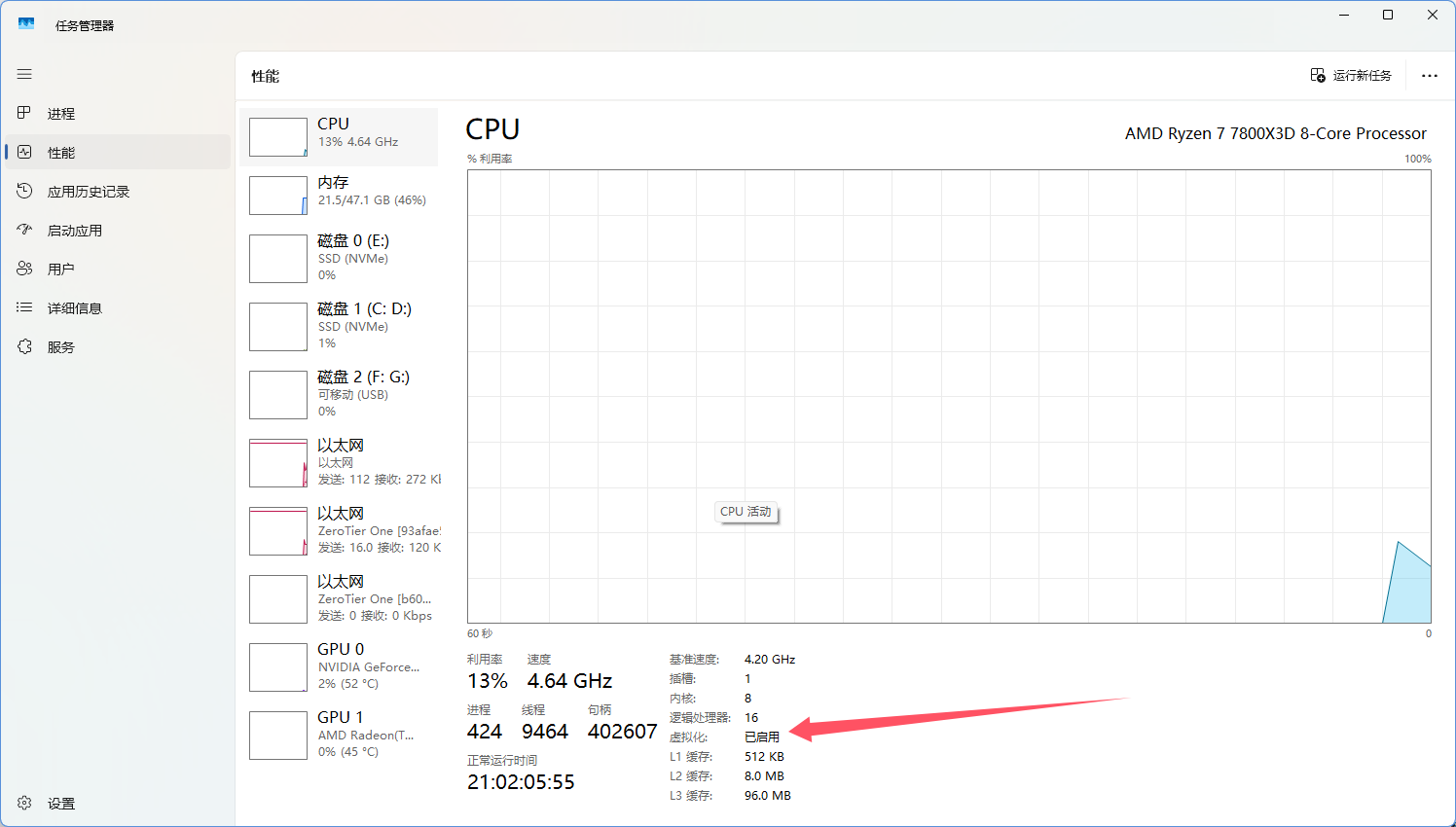 - 重启后,运行Ubuntu子系统,如在弹出的PowerShell中,出现以下提示,一般为电脑CPU没有开启虚拟化功能导致的,可在任务管理器——性能——CPU中检查是否开启了虚拟化,如无需自行参考各主板(笔记本)的BIOS中的虚拟化开启方法(如果你能玩三角洲,虚拟化一定是开启的)