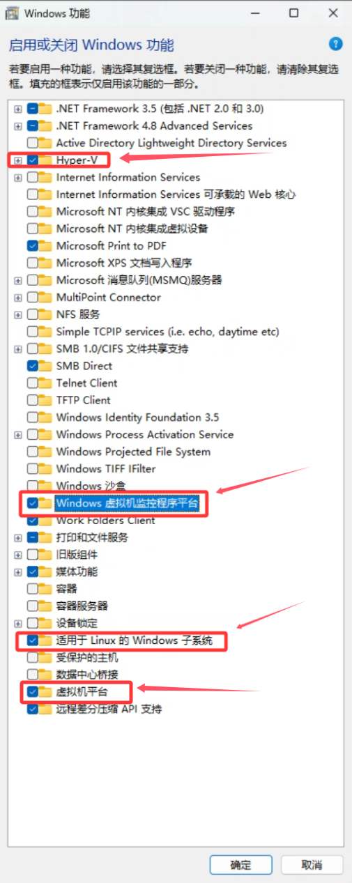 - 如下图所示,选中“Hyper-V、Windows虚拟机监控程序平台、适用于Linux的Windows子系统、虚拟机平台”,如功能菜单中不存在Hyper-V,可忽略确定,等待安装完成后重启电脑。
