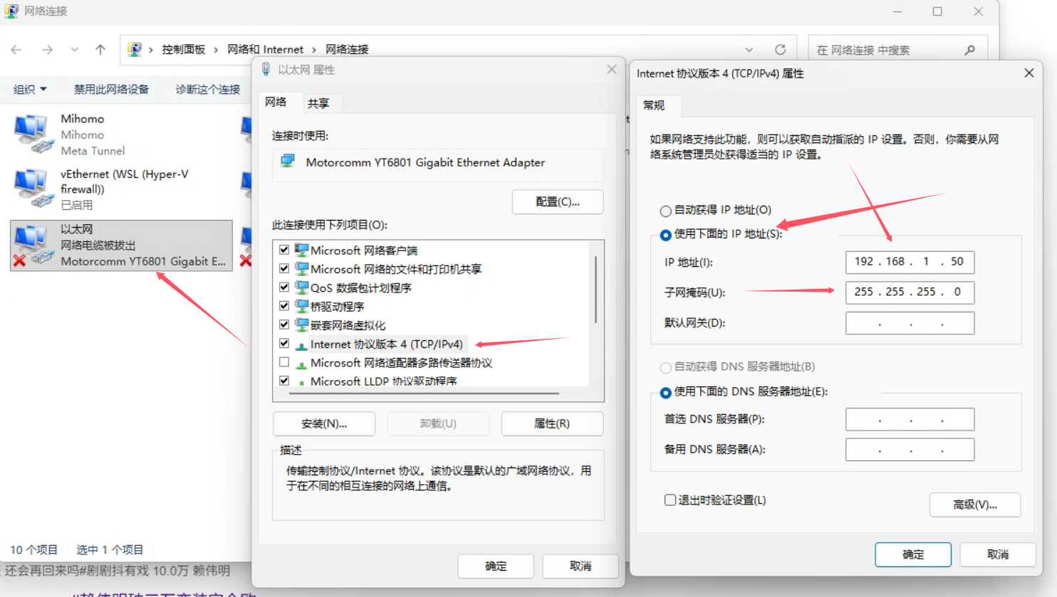 将2USB-A、1xRJ45(网线接口)连接到电脑后,在控制面板-网络和共享中心-更改适配器设置-找到类似以太网等有线连接的物理网口,右键属性,找到Internet协议版本4,双击打开,将有线网卡的地址配置为手动模式,IP为192.168.1.50,网址掩码255.255.255.0,如下图所示