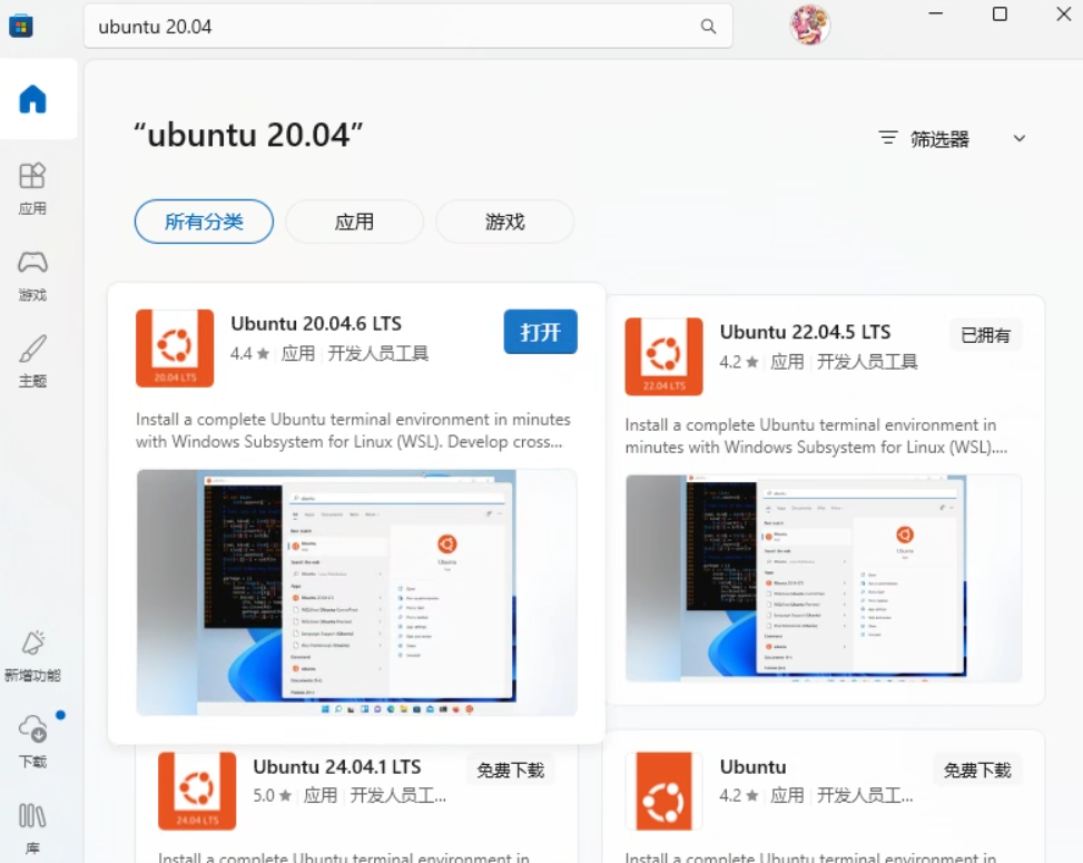在win开始页面搜索Microsoft store。在商店页面搜索Ubuntu20.04,安装Ubuntu 20.04.6 LTS(长期支持版)